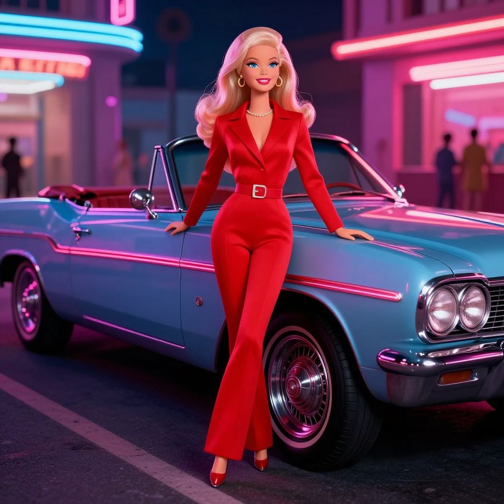 Barbie jumpsuit scene illustrating Barbie in a bold red jumpsuit leaning against a vintage convertible car in a retro 80s neon-lit street, vibrant colors, dynamic reflections on the car and pavement, night time urban setting with energetic mood
