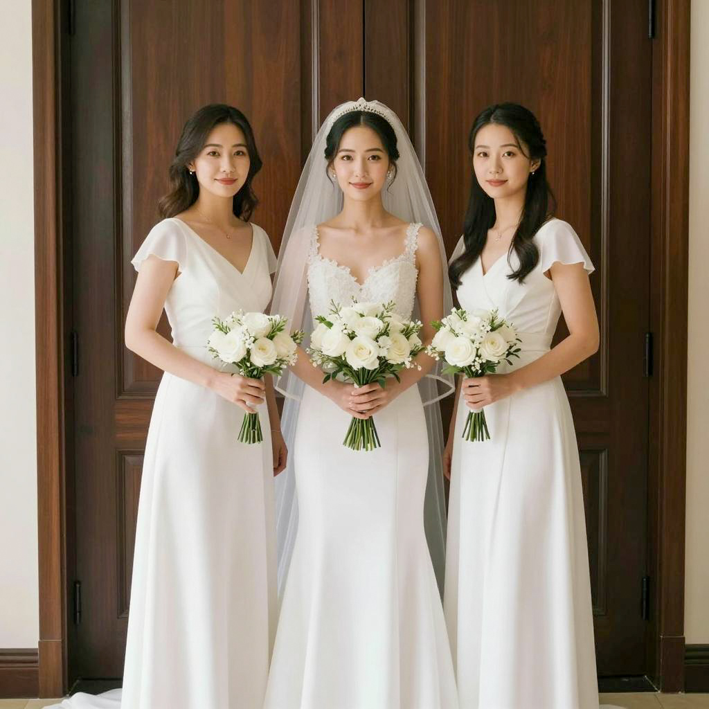 Wedding dress maids, photograph of three women, wedding attire, white dresses, bride in center with bouquet and veil, two bridesmaids on either side with bouquets, standing in front of dark wooden door, soft lighting, indoor setting, relaxed pose, natural light, minimal background, elegant, formal, realistic style, traditional wedding theme, three females, full body shot