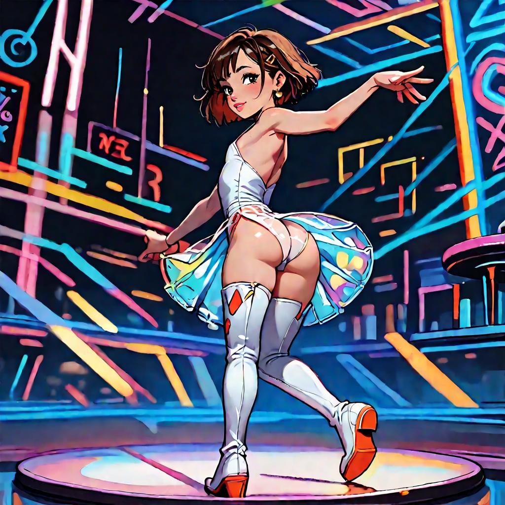 Score_9, score_8_up, score_7_up, score_6, score_5, score_4, cute thin 20yo slutty femboy twink, (brunette:1.5), hair_clip, earrings, short hair, (wide_hips:1.2), aroused, looking at viewer, (long_slender_legs:1.2), (flat_chest), (tiny bulge:0.5), (white thigh high boots), (high leg white playboy leotard), (translucent_see_through_white_flared_mini_skirt:1.3), (perfect ass:1.2), (full body shot:1.5), (dancing:1.3), (nightclub, dance floor, multi coloured neon graffiti, neon signs), (from behind:1.4)