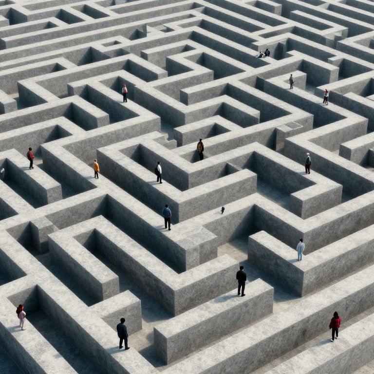 Photograph of a large, complex, gray concrete maze with high, rectangular walls. Seven people, dressed in various winter clothing (coats, hats) in colors including red, black, and blue, are scattered throughout the maze, some standing, others walking. The maze's textured walls cast shadows, creating a sense of depth and complexity. The people are small in comparison to the towering walls, emphasizing the maze's scale. The background is entirely filled with the maze, and there are no visible exits or entrances. The lighting is bright, highlighting the maze's geometric patterns.