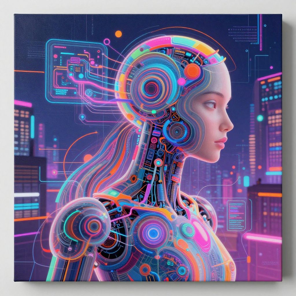 Open AI art showcasing a futuristic digital canvas with vibrant neon colors, abstract robotic forms blending with human creativity, glowing circuits and holographic brush strokes in a cyberpunk cityscape background, ultra-detailed and surreal.