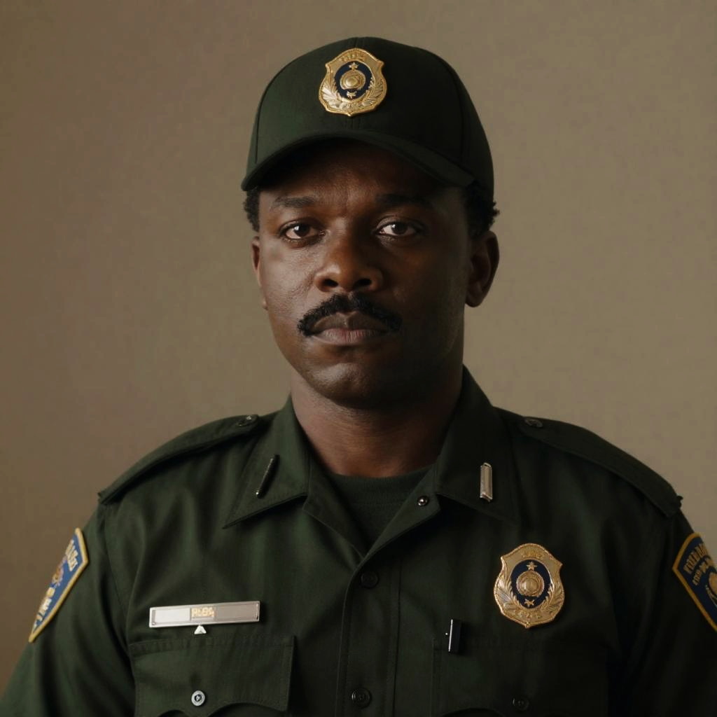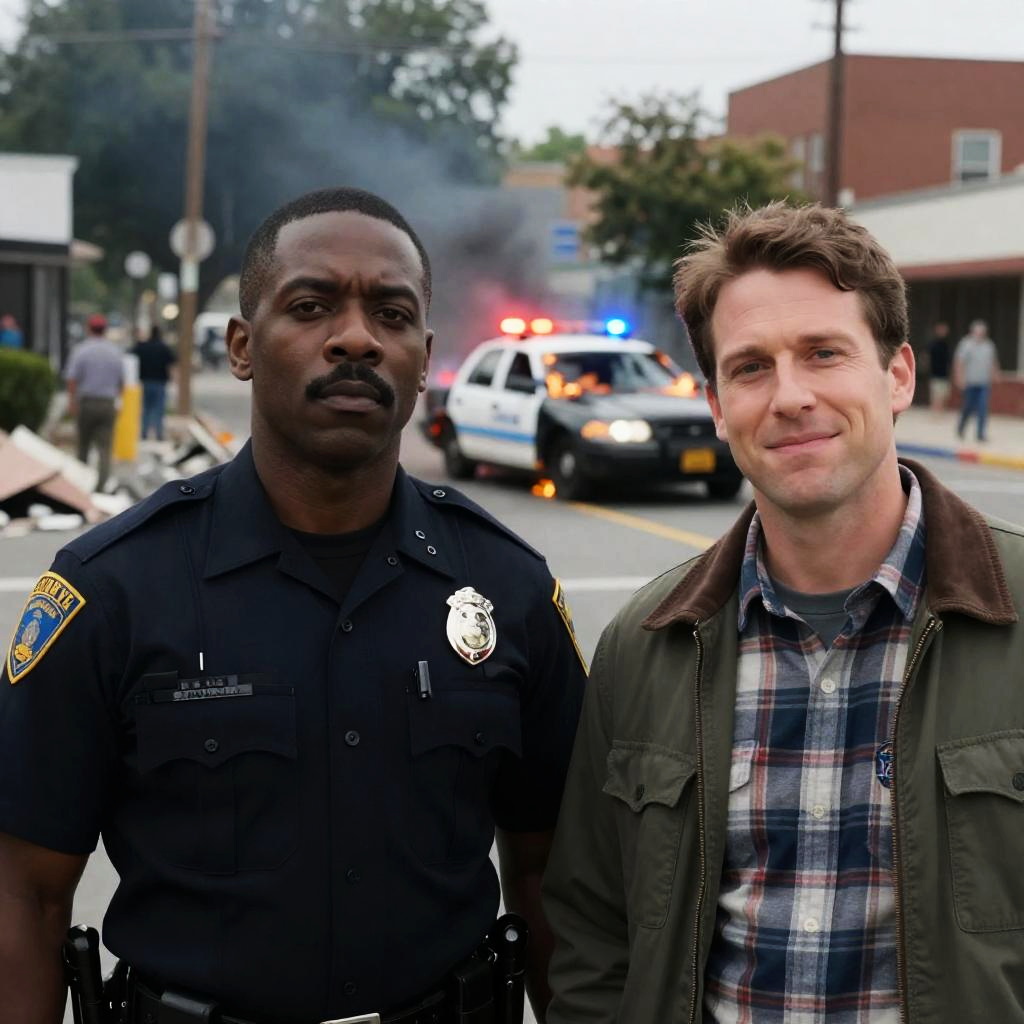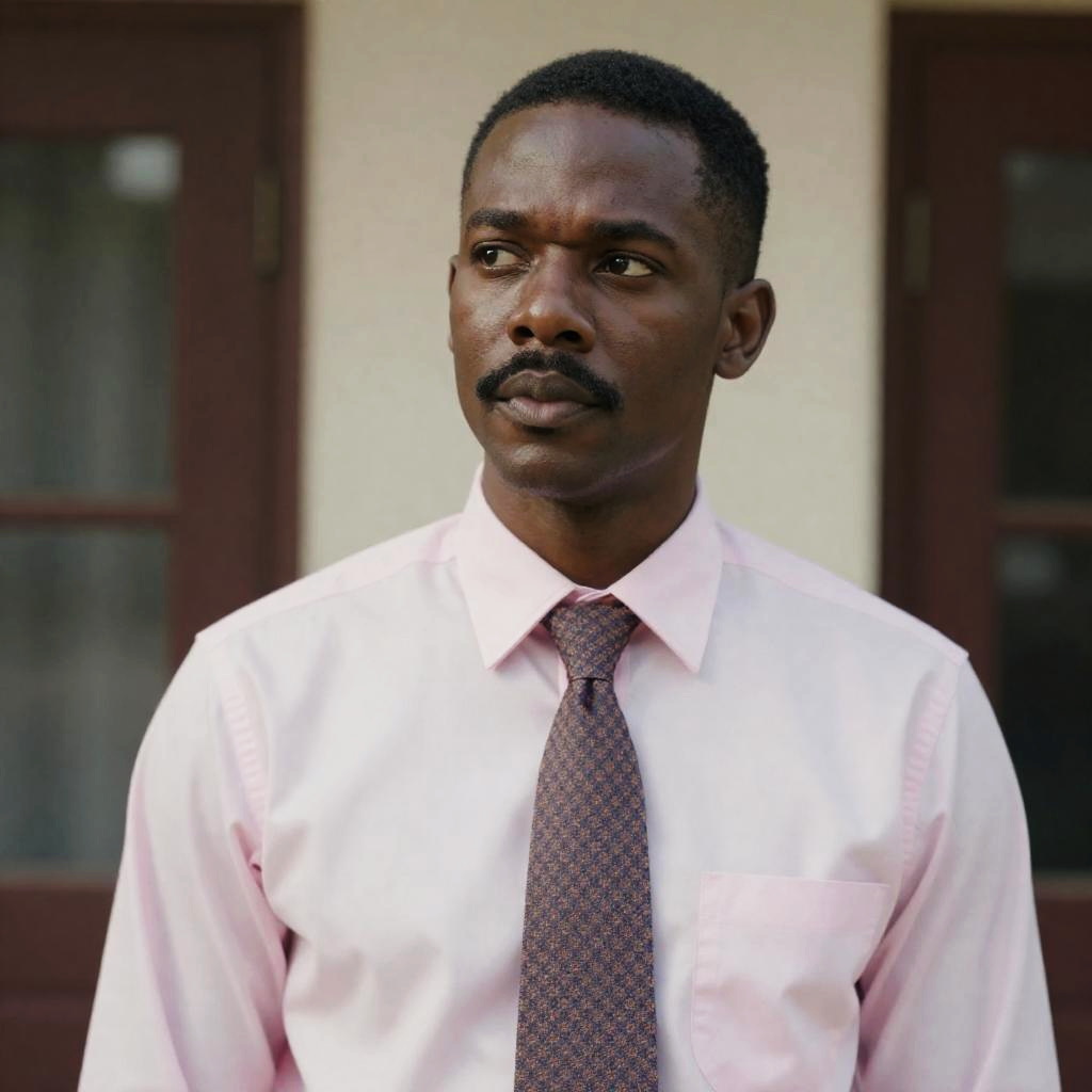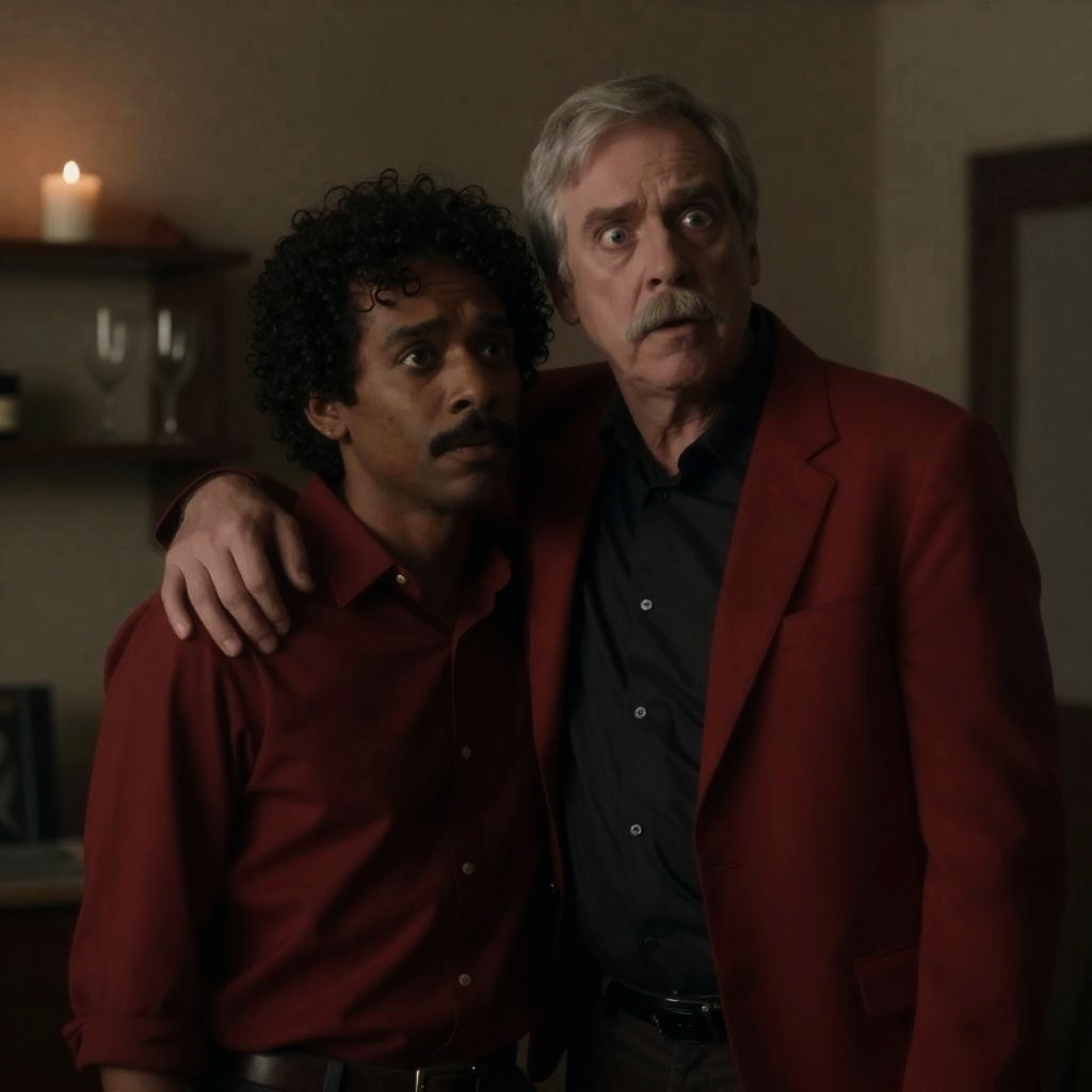 Photograph of a smiling Black man with a mustache, holding a framed picture of himself and two other men in Hawaiian shirts, standing in front of a movie poster. Background includes vertical blinds.