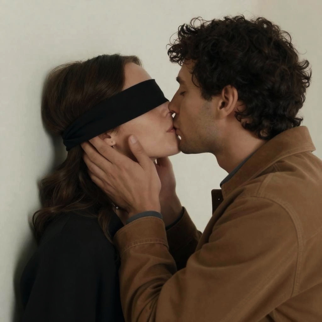 Photograph of a blindfolded woman with wavy brown hair, light skin, and a choker, kissing a man with curly dark hair, light skin, and a brown jacket. She leans against a ured wall, his hand holds her head. Intense kiss.