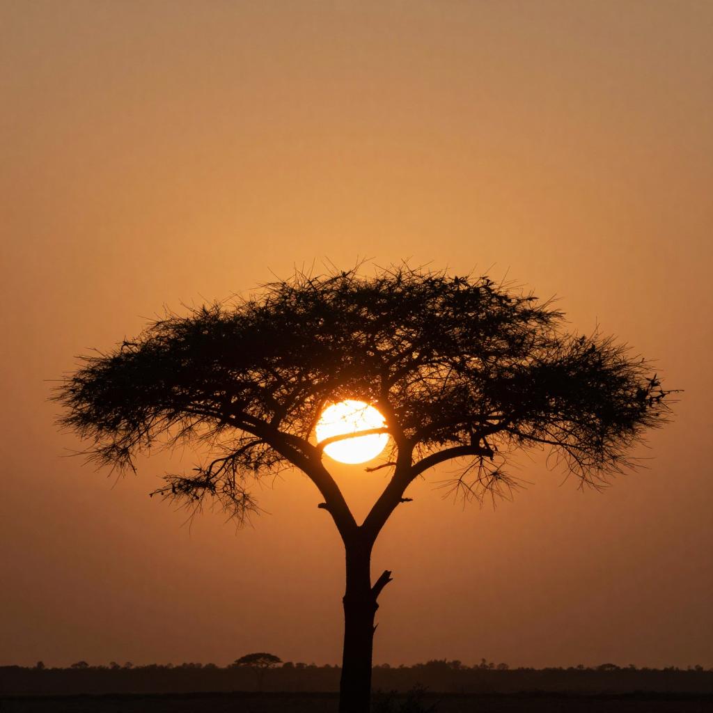 Photograph of a single acacia tree silhouetted against a vibrant orange sunset. The sun is almost perfectly centered behind the tree, creating a glowing halo effect. The sky is a rich, gradient orange, and the tree's branches are dark and sparse. The horizon is a simple, dark line at the bottom of the image. The overall vibe is serene and warm.