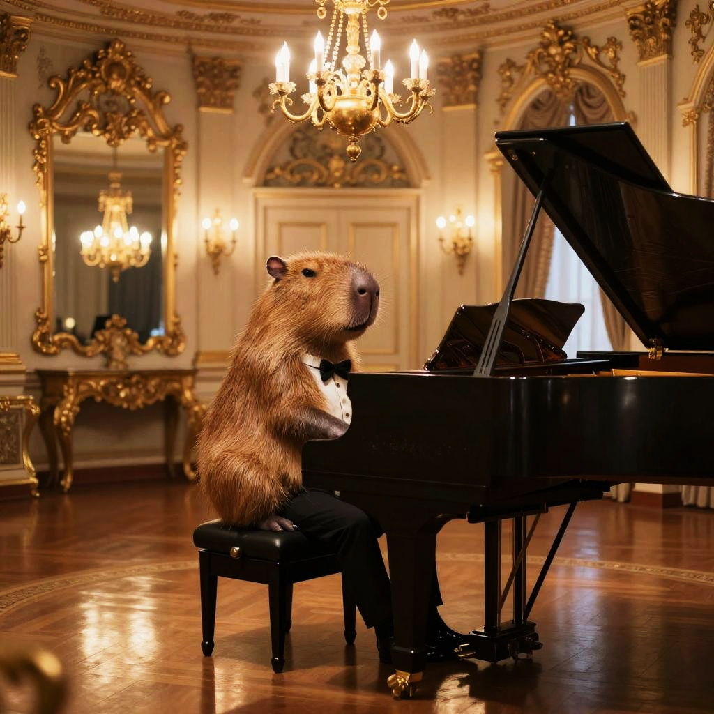 Capybara in tuxedo sitting elegantly at a grand piano in a luxurious vintage ballroom, golden chandeliers hanging above, reflections on polished wooden floor, detailed textures, baroque style with a warm, nostalgic atmosphere.