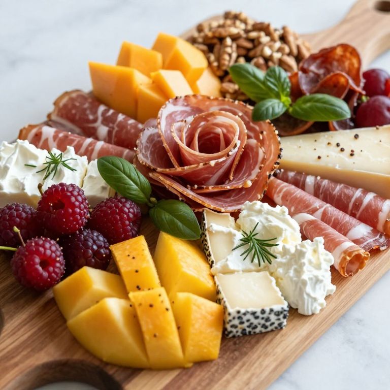 Charcuterie board featuring vibrant fruits, savory meats, creamy cheeses, crunchy nuts, and fresh herbs artfully arranged on a wooden platter, showcasing a delightful blend of textures and flavors.