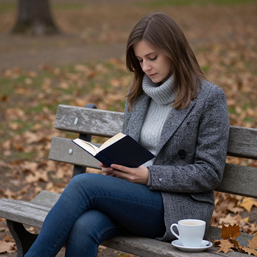 A man sitting on a park bench in a city, reading a book, surrounded by pigeons and people passing by, highlighting everyday life.