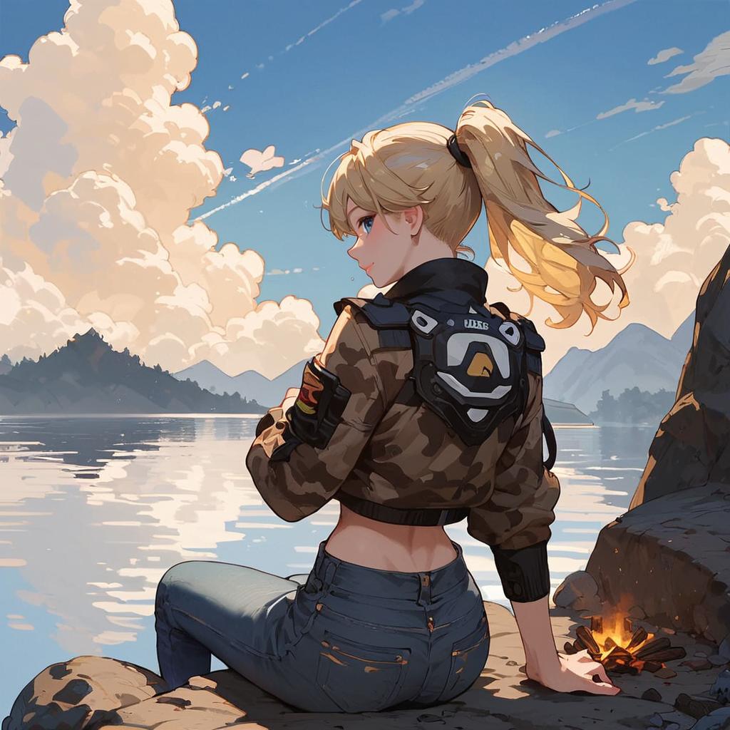 Score_9, score_8_up, score_7_up, score_6_up, source_anime, anime screencap, sitting, full body, from behind, looking back, blonde hair, ponytail, blue eyes, light smile, camouflage jacket, jeans, boots, cloud, outdoors, blue sky, sunlight, lake, mountain, rock, campfire