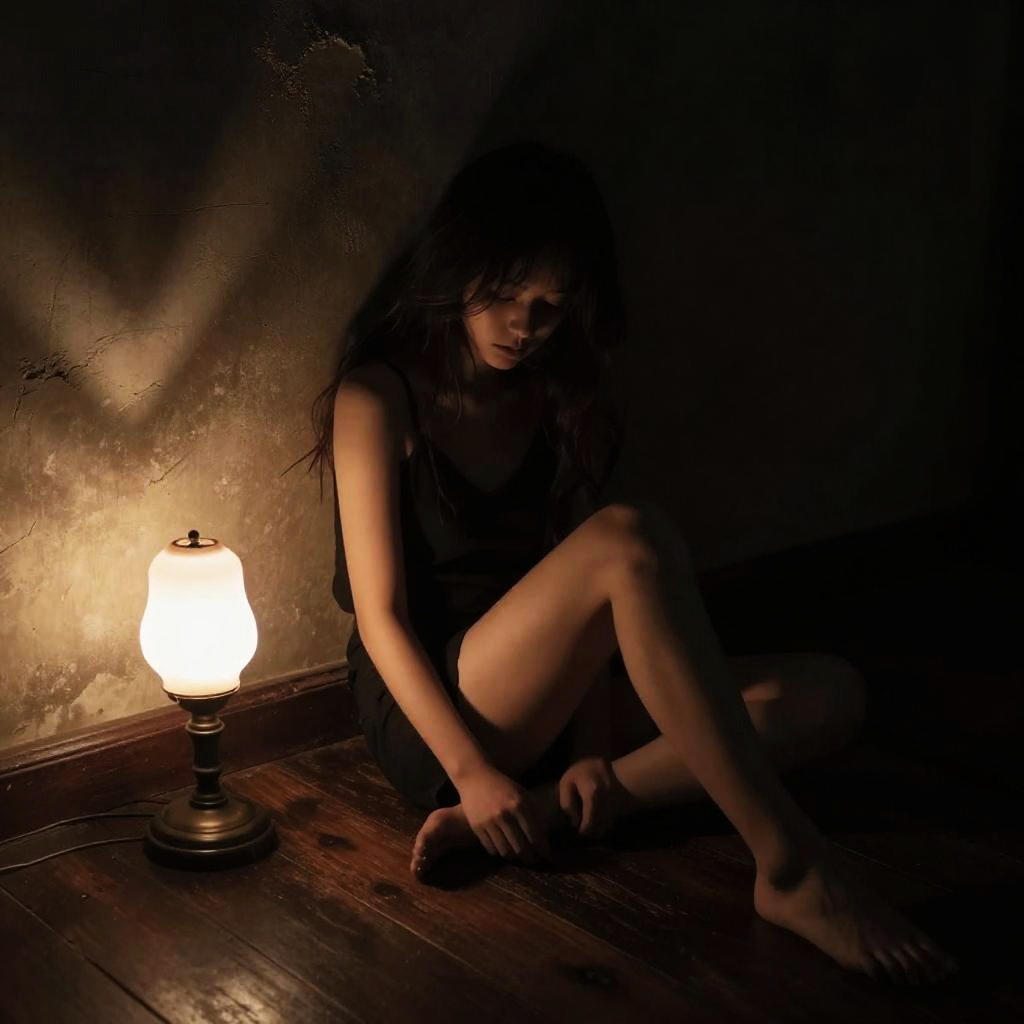 Girl in dark room sitting on an old wooden floor, faint glow from a vintage lamp, textured shadows, moody and atmospheric, artful chiaroscuro style