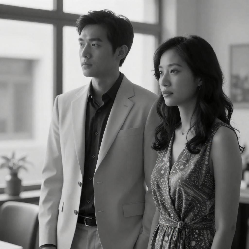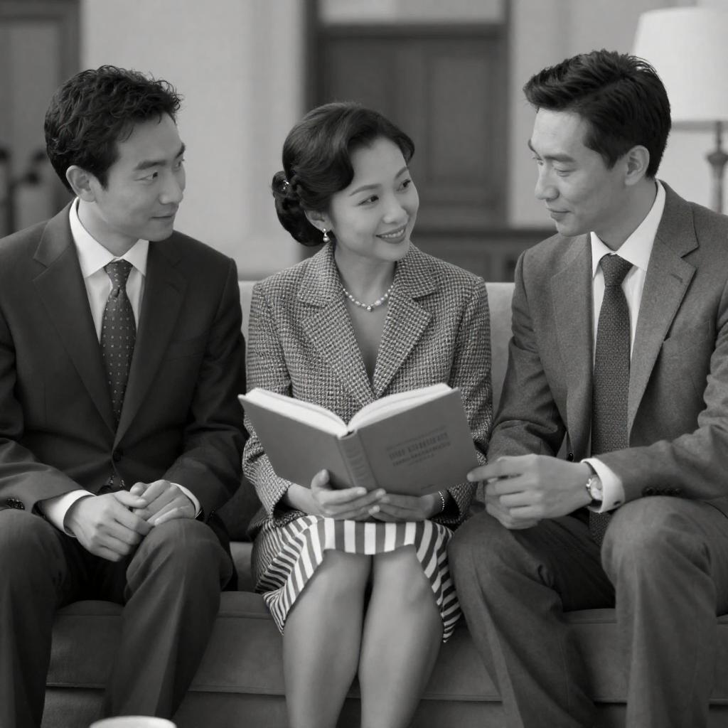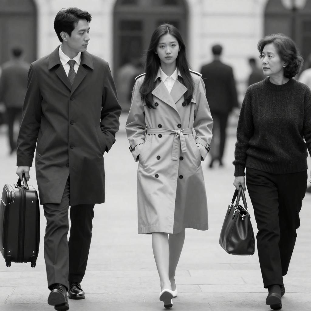 Black-and-white photograph of three people walking together. A man in a dark coat and tie holds a suitcase on the left, a young woman in a light trench coat with hands in pockets is in the center, and an older woman in a dark sweater and holding a leather handbag is on the right.