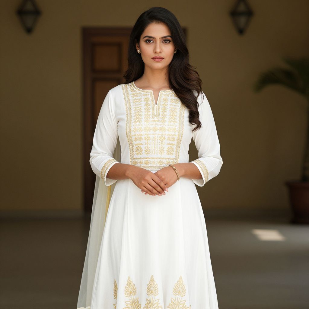 Photograph of a young South Asian woman in a green and yellow traditional dress with gold embroidery, standing in an arched, sandy-colored courtyard, wearing