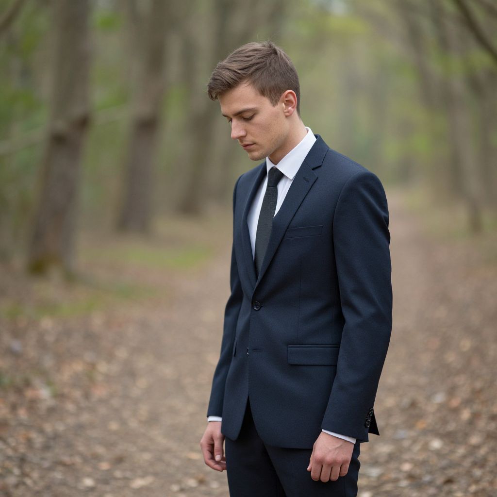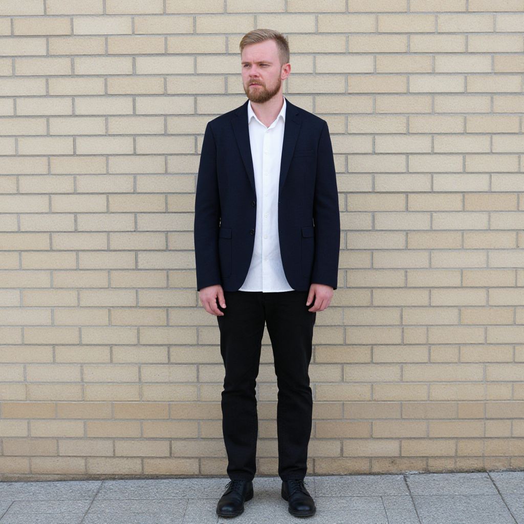 Photograph of a blonde man with a beard standing against a beige brick wall. He's wearing a dark navy blazer over a white button-up shirt, black pants, and black shoes. His posture is relaxed, arms by his sides, and he's looking slightly off to the side with a neutral expression. The ground is paved with gray stones.