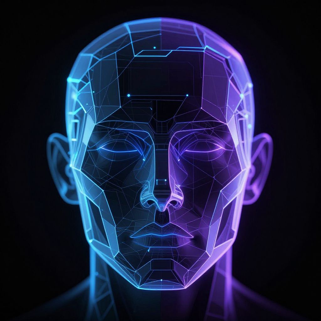 Digital art of a silhouetted male figure walking through a neon-lit, maze-like path with gradient blue and pink lighting.