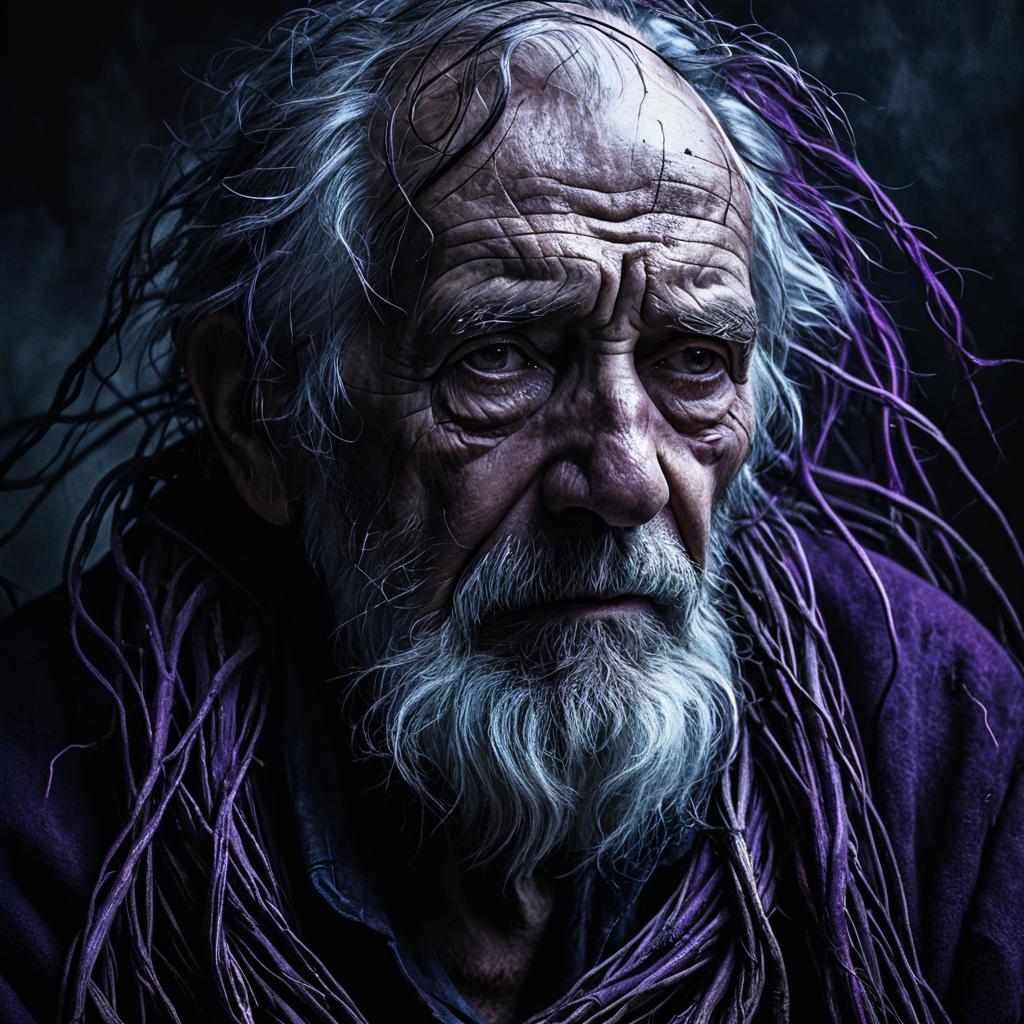 High detail dark fantasy portrait of a weary elderly man with deep wrinkles, white beard, and tangled deep violet roots entwined around him. The composition uses dramatic lighting to evoke emotions of melancholy, wisdom, and fatigue with a realistic, unsettling atmosphere.