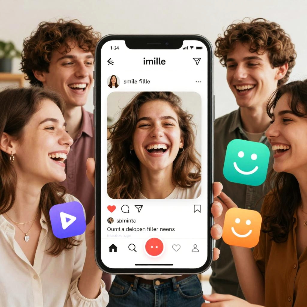 Smile filter online digital tool visualized in a casual social media setting, mixed group enjoying laughter with enhanced smiles, colorful UI overlays floating around, modern and sleek app aesthetics, bright and uplifting ambiance, detailed and natural facial features, interactive and fun user experience