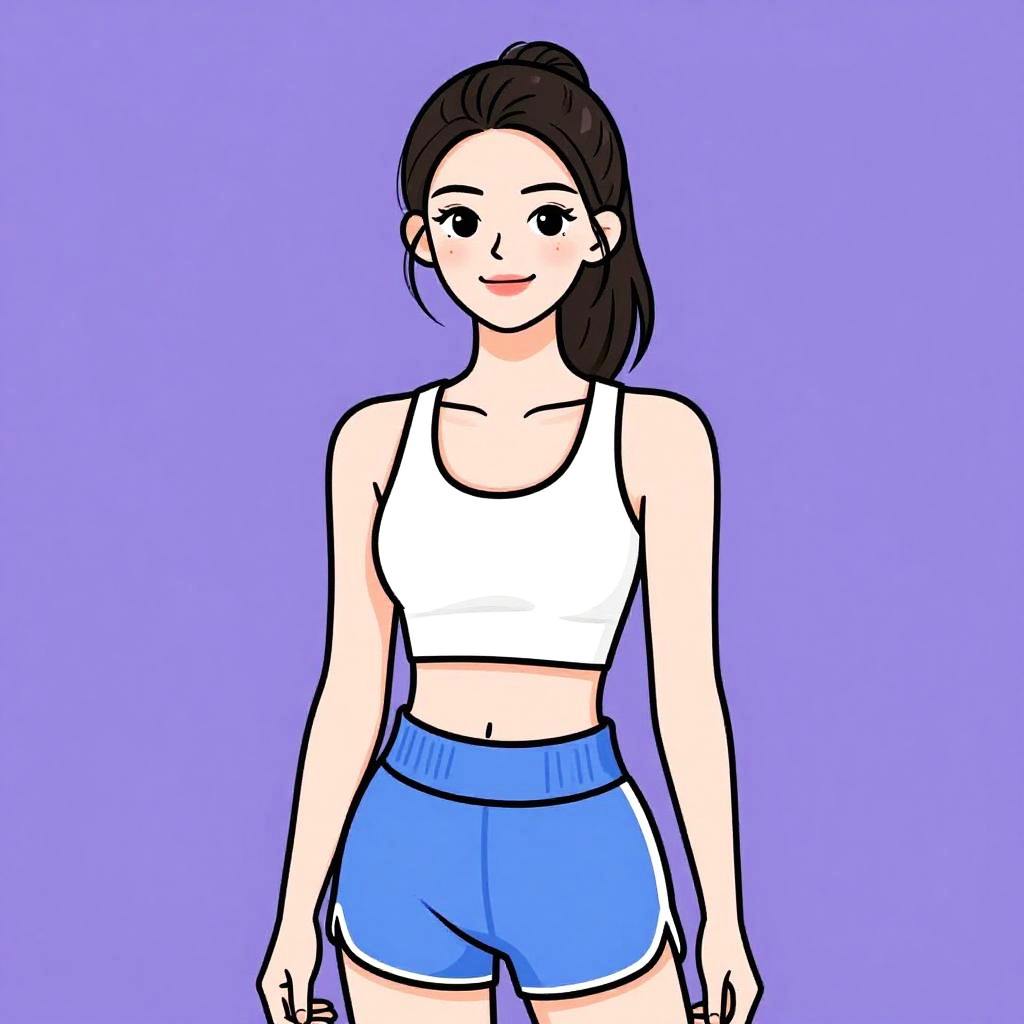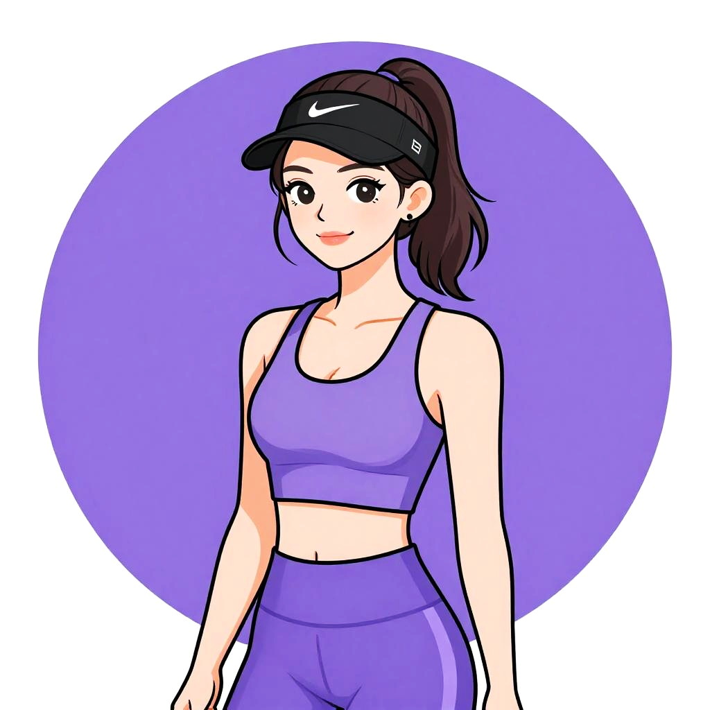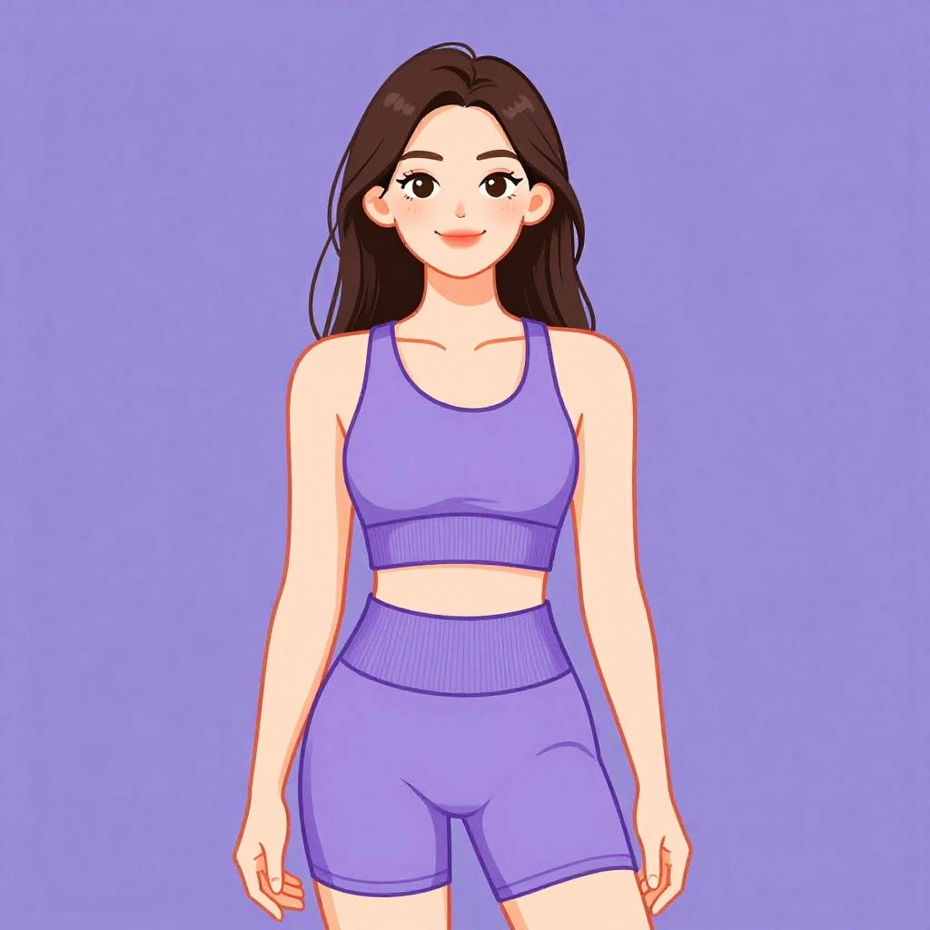 Illustration of a young woman with a pretty face and neatly styled hair wearing a sleeveless brown cropped tank top with a high neckline and racerback style, paired with matching high-waisted leggings featuring a slight V-cut waistband. The outfit is form-fitting and set against a plain purple studio background.