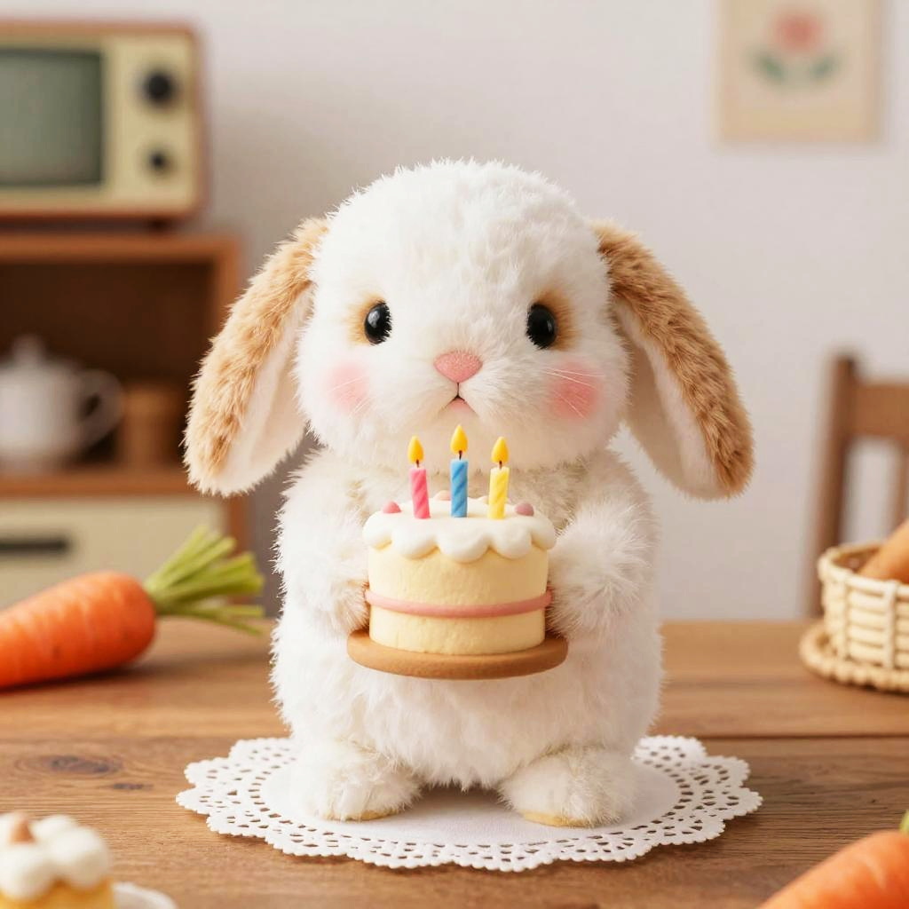 A cute photograph of a small, fluffy, white and brown stuffed bunny with pink cheeks, holding a tiny, round birthday cake with colorful candles. The bunny stands on a lace doily on a wooden table, with a blurred background featuring a shelf with vintage items and a carrot. The scene is brightly lit and whimsical.