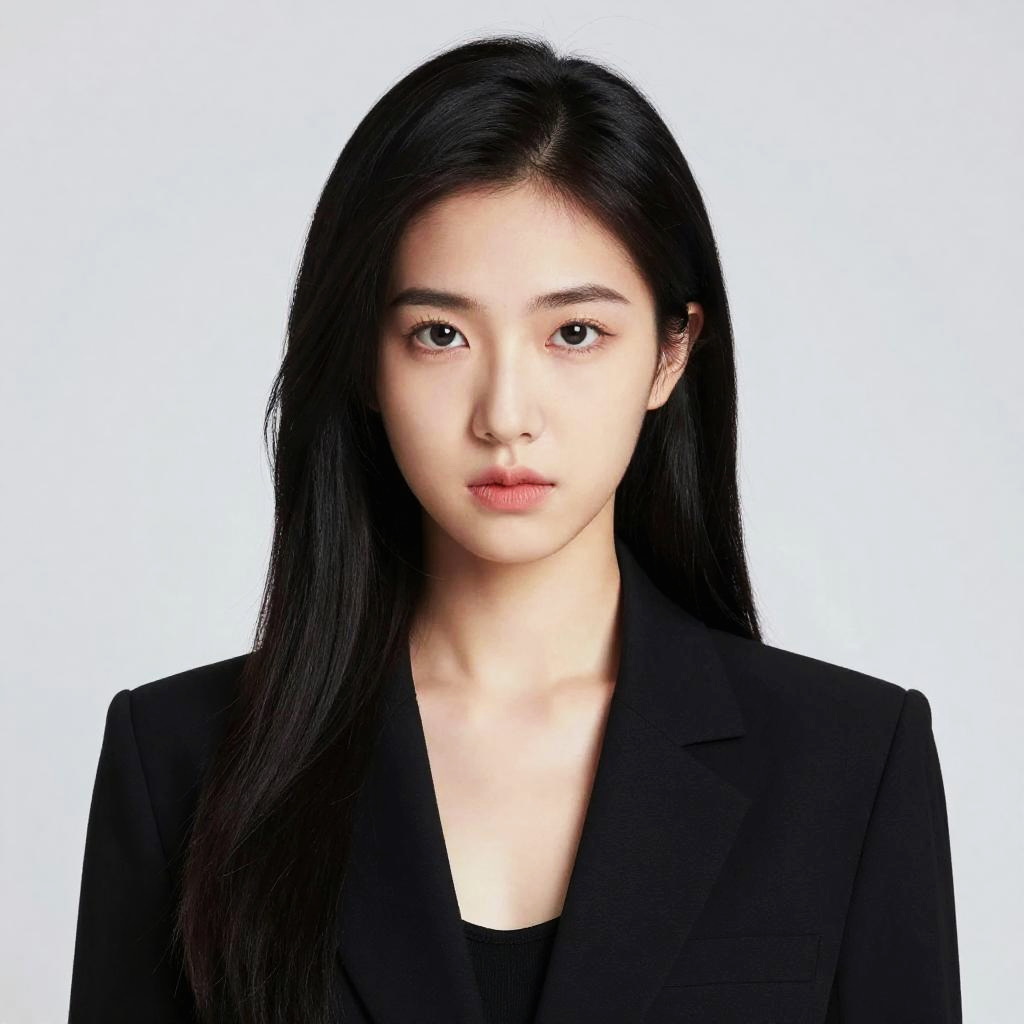 Photograph of a young East Asian woman with long black hair, fair skin, and soft expression, wearing a black blazer, against a plain white