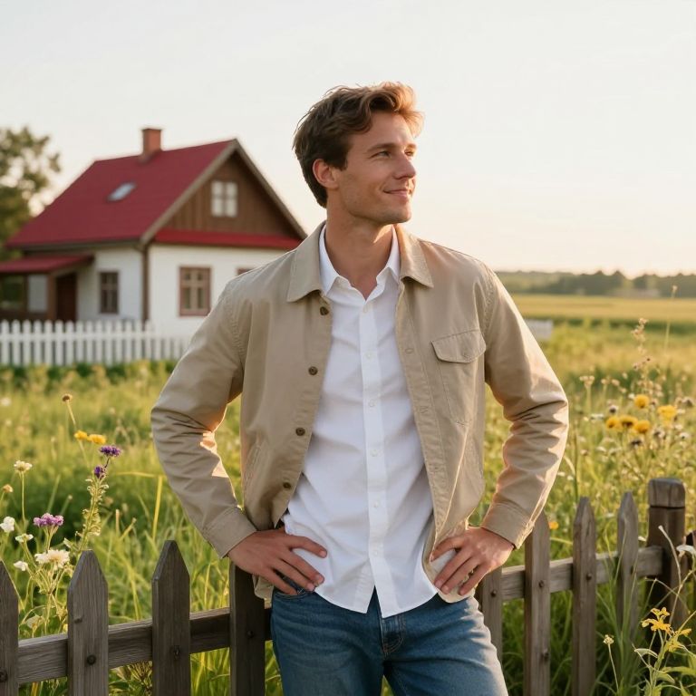 A man with warm brown hair and a full, neatly trimmed beard stands in a sunny meadow, wearing a crisp white shirt adorned with vibrant orange sunflowers embroidered along the sleeves and collar. The sun shines brightly behind him, casting a golden glow over the scene. He has a friendly, calm expression, looking slightly amused as he holds a small wooden stick in his hand. The background features a gentle landscape with rolling hills and wildflowers, adding a peaceful, natural atmosphere.