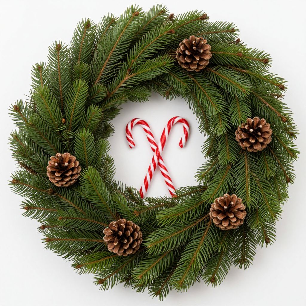 Circular wreath crafted from vibrant green pine branches, interspersed with three brown pinecones and a classic red-and-white striped candy cane, elegantly intertwined at its center.