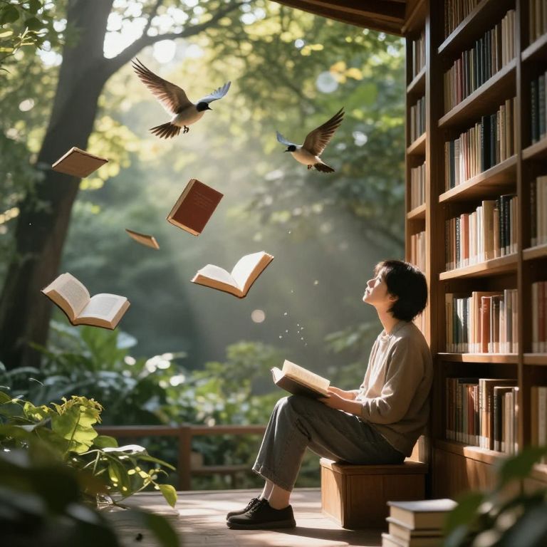 In a serene library bathed in sunlight, books float gracefully like birds, weaving through the air as if alive, while a reader sits in quiet wonder, surrounded by nature and the magic of stories taking flight.