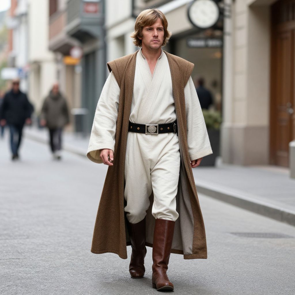 Luke Skywalker Replica Costume, man in a robe and belt walking down a street