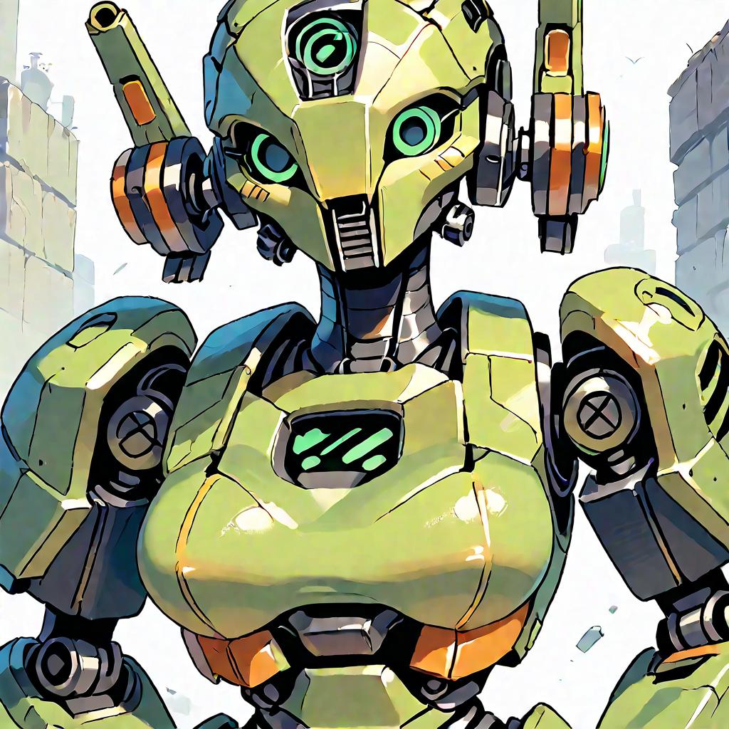 Score_9, score_8_up, score_7_up, score_6_up, score_5_up, source_furry, kame 3, assaultron, fallout, 1girl, solo, breasts, looking at viewer, robot, humanoid robot, robot joints, one-eyed, joints, no humans, green skin, mechanical arms, crotch plate, science fiction, post-apocalypse, outside