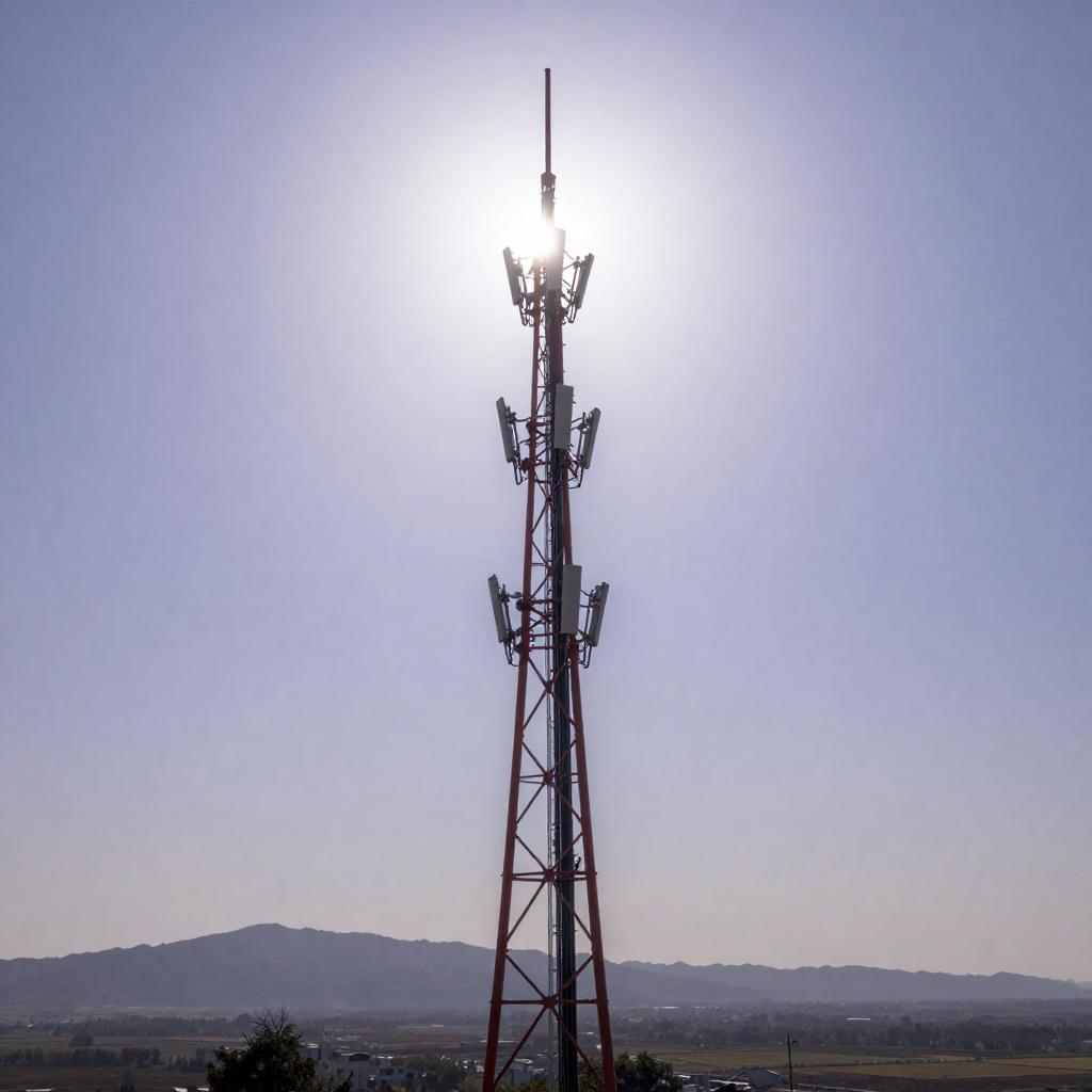 Photograph of a tall, slender, red communication tower centered in the frame, with the sun directly behind it, creating a bright halo effect. The background features a vast, hazy landscape with distant mountains and a light purple sky. The tower's top antenna points upward. The image has a minimalist, serene quality.