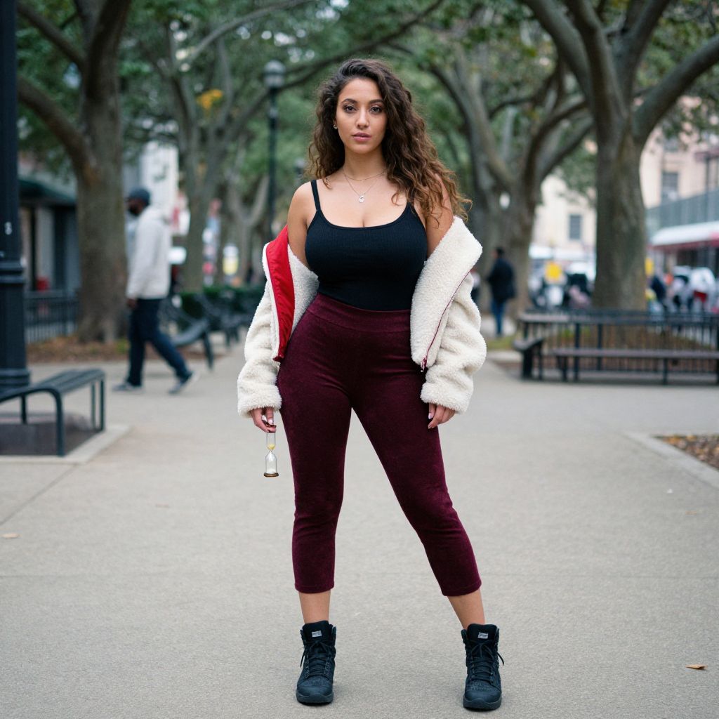 A Hourglass woman in casual streetwear, wearing a black tank top, burgundy velvet cropped leggings, and an off-white shearling-lined jacket with red details, stands in a city park shaded grove. She sports ankle-high black sneakers and has her curly hair loose, captured in the visual style of Eastman LLP film stock. Sexy. Pretty face and beаutiful eyes. Big breasts