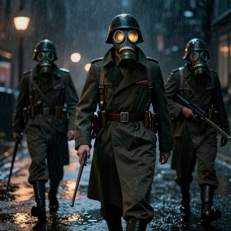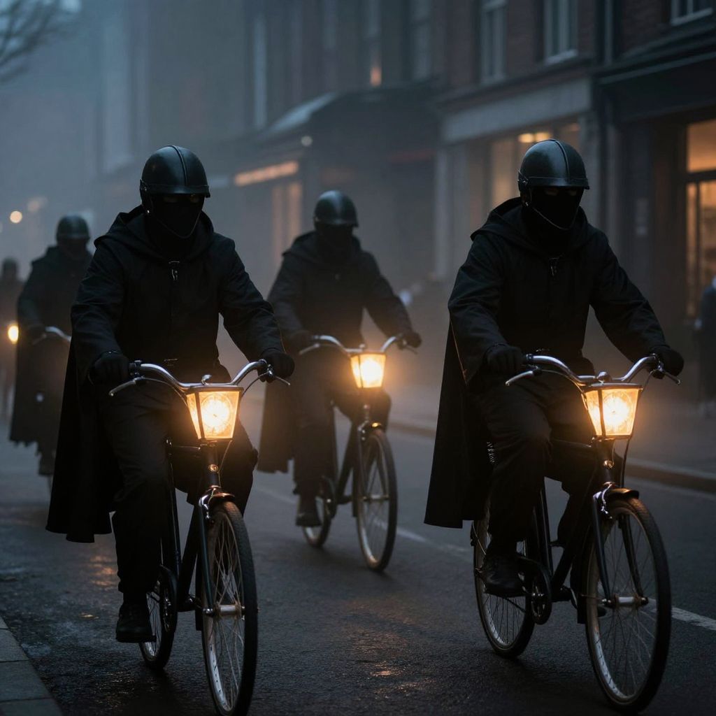 Night-watchmen clad in shadowy cloaks and helmets glide through a misty urban landscape, their bicycles illuminated by radiant lanterns that cast ethereal glows, hinting at a world where time and memory intertwine.