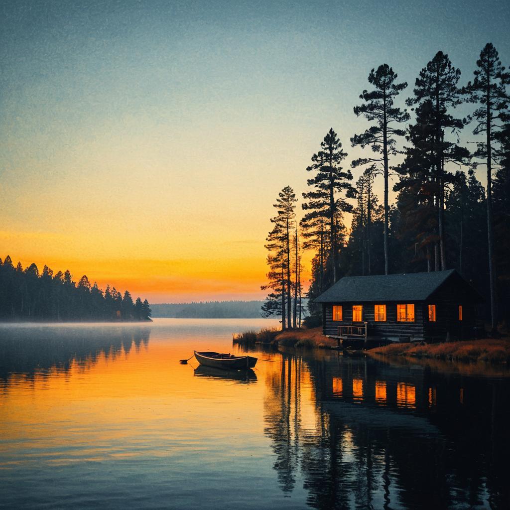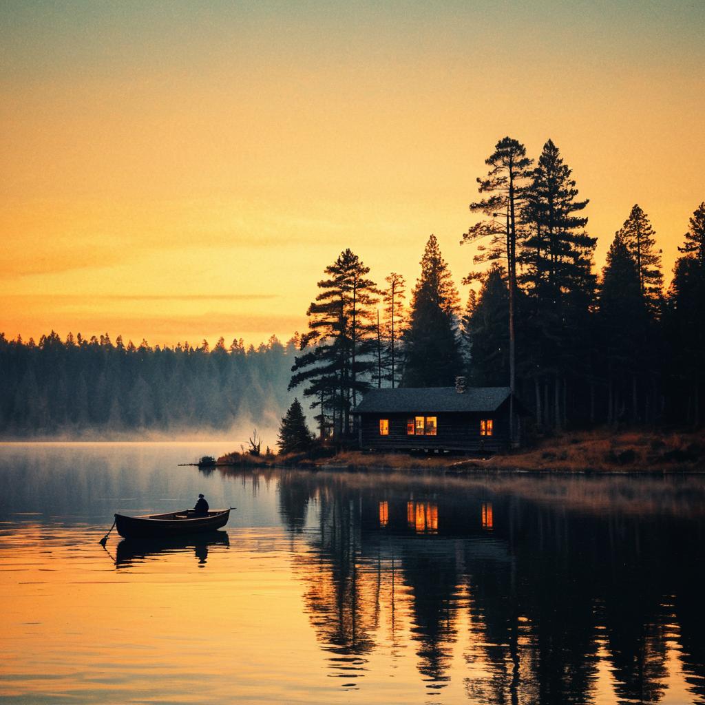 A serene lakeside scene featuring a rustic wooden cabin with warmly lit windows beside calm water. A small wooden boat with an outboard motor floats quietly on the lake, reflecting the golden hues of the sunset. Tall pine trees surround the cabin and line the shore, their silhouettes accentuated by the fading orange light and light evening fog.