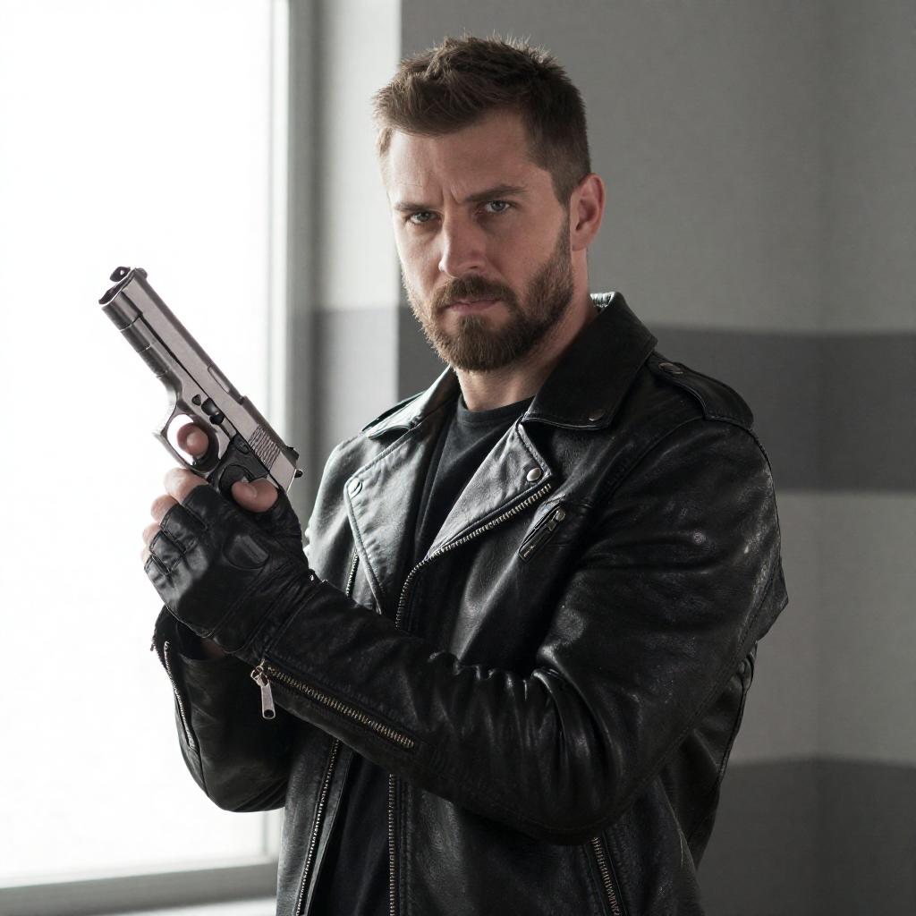 Photograph of a dark, industrial warehouse scene. A bearded man in a black shirt and pants, holding a gun, stands to the left. Another man, in a black hoodie and mask, is mid-air, aiming a gun towards him. Bright lights in the background create dramatic shadows and a misty atmosphere. Debris and crates are scattered on the floor.