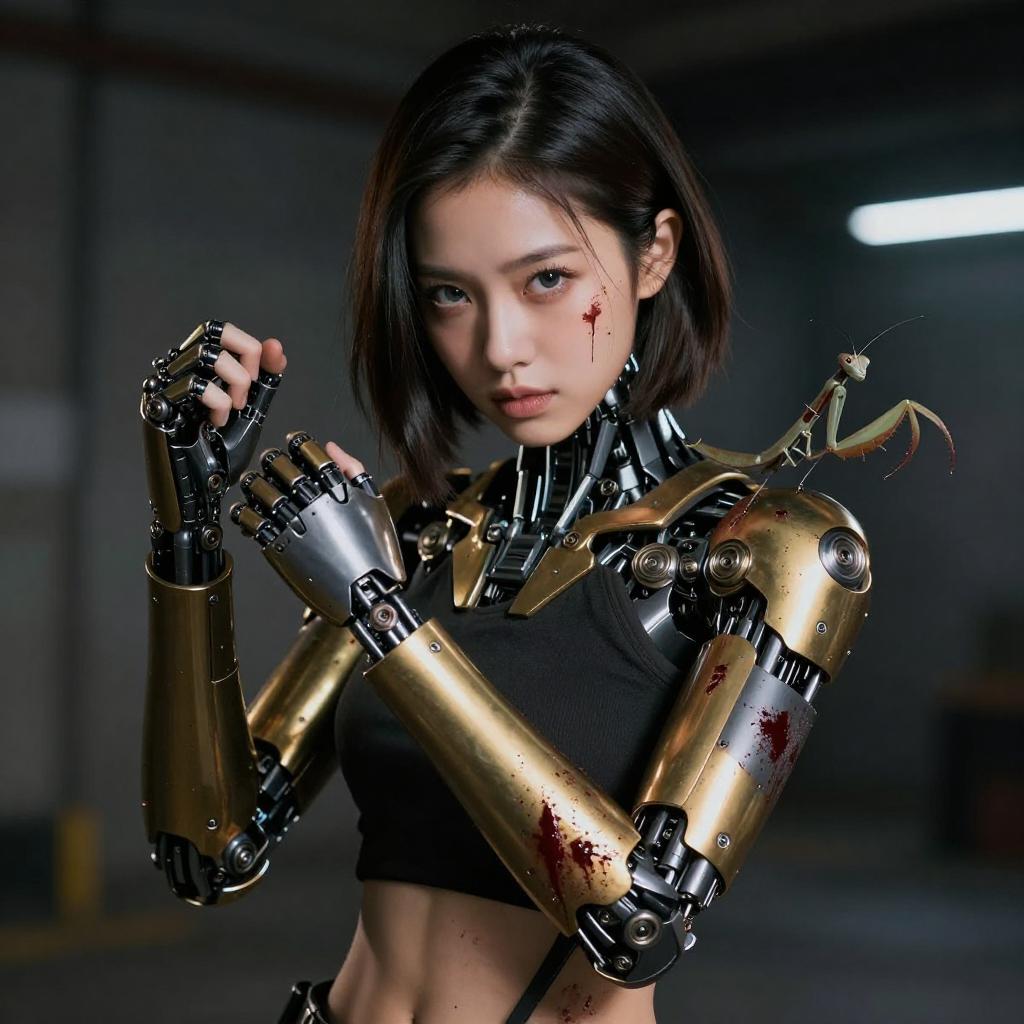 Cyberpunk girl with black gold cybernetic limbs bloodied from a recent fight but looking for more and looking at the camera delinquent expression, character artwork, cheery, mantis, cyberpunk bionics, detailed faces, dramatic lighting, cinematic, high detail, octane render, unreal engine, 8k, dark beauty, trending on artstation, cyberware style, mechanical arms, bust