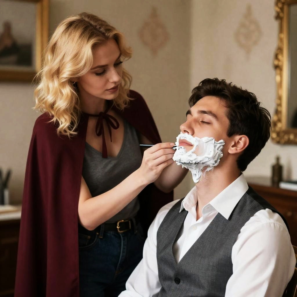 Photograph of a blonde woman with curled hair, wearing a deep red cape and a gray top, applying shaving cream to a man's face. The man, with short dark hair, is sitting and wearing a gray vest over a white shirt. Ornate wallpaper and a framed picture in the background. The woman's expression is focused, while the man's face is relaxed. Both are indoors.