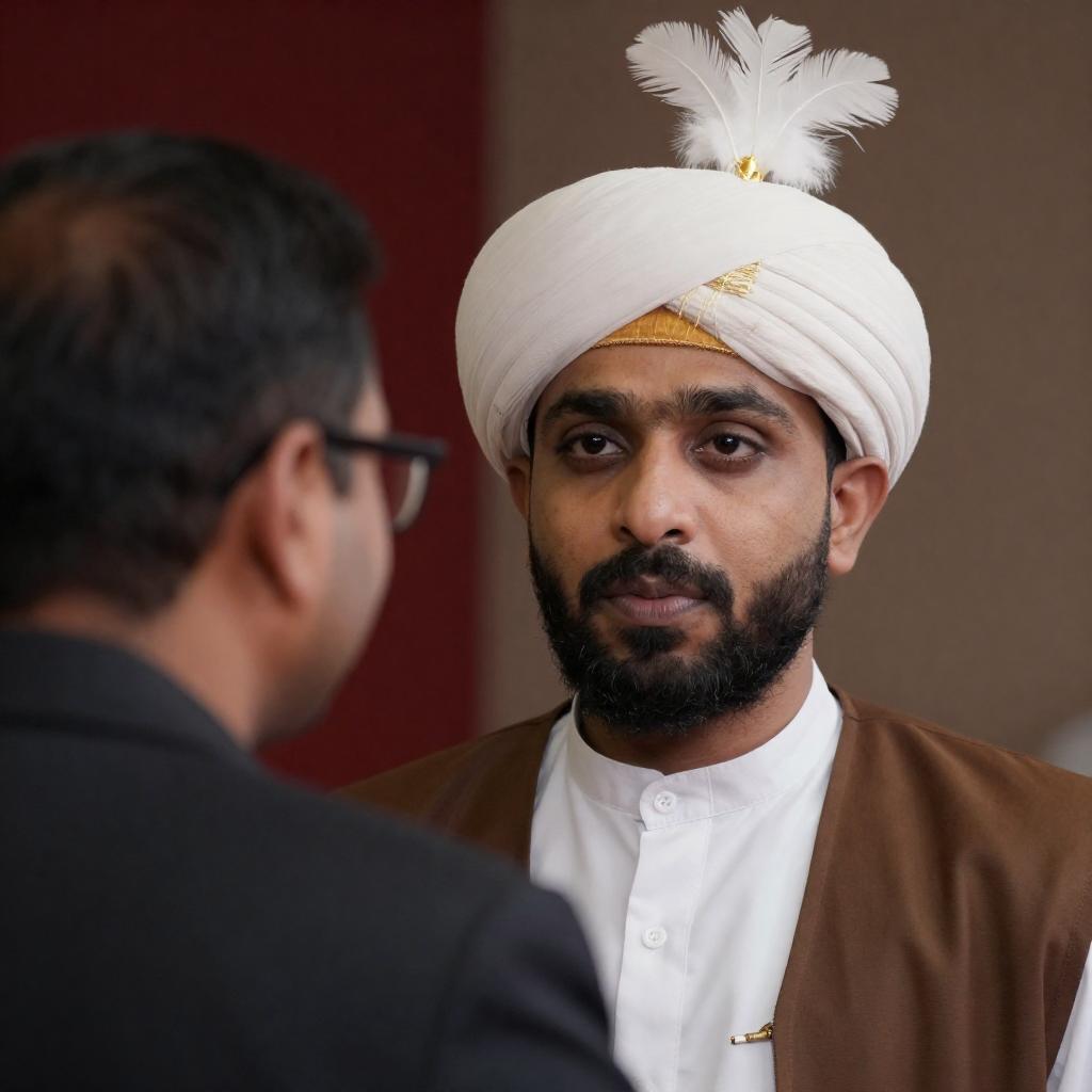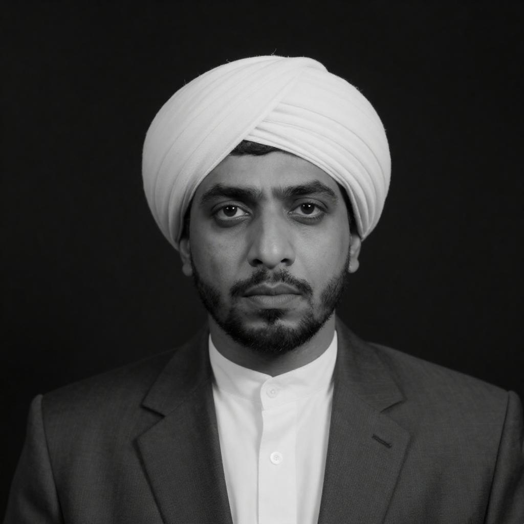 Black and white photograph of a serious man with intense gaze, wearing a white turban, dark suit, and white shirt. Background is completely dark, focusing attention on his face. Medium close-up, centered composition.
