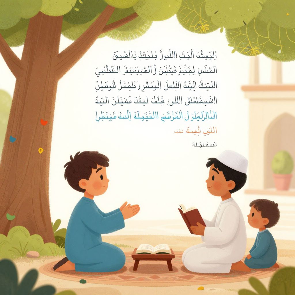 Islamic prompt: A children's book scene showing a young boy receiving an Islamic lesson under a courtyard tree, with illustrated Quranic verses and colorful patterns, teaching values like kindness, honesty, and compassion in a warm, educational environment.