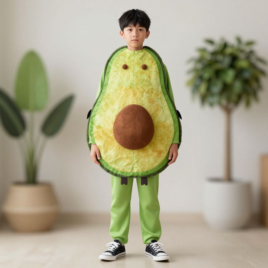 Photograph of a young boy with short black hair, wearing a full-body avocado costume. The costume features a yellow and green gradient with a large brown circular pattern in the center, resembling an avocado pit. He has green sleeves and pants, and black and white sneakers. The background is a blurred indoor setting with two potted plants, one green with large leaves and the other a bushy plant in a white pot. The boy stands centered, looking slightly to the left, with a neutral expression. The lighting is bright, highlighting the costume's texture.