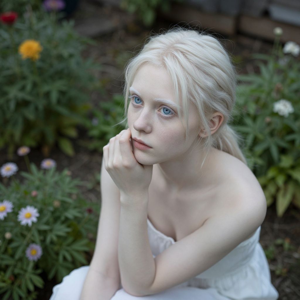 Photograph of a fair-skinned, young woman with platinum blonde hair and striking blue eyes, sitting in a garden. She has a slender build and is wearing a white, strapless dress. Her right hand rests on her chin, and she gazes thoughtfully upward. The background features a variety of green plants and colorful flowers, including daisies and a yellow bloom. The image has a slightly ethereal, dreamy quality with soft lighting, highlighting her delicate features and pale complexion. The overall mood is serene and introspective.
