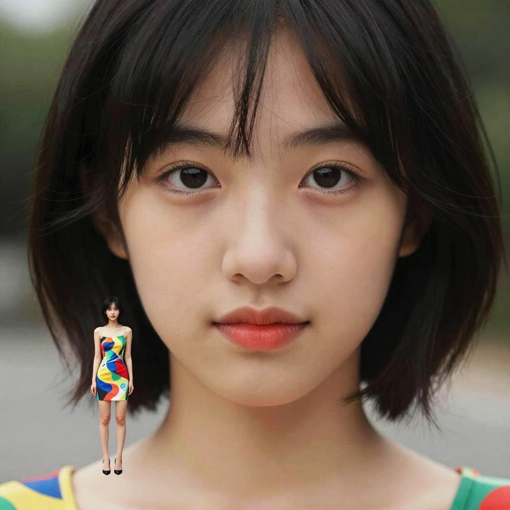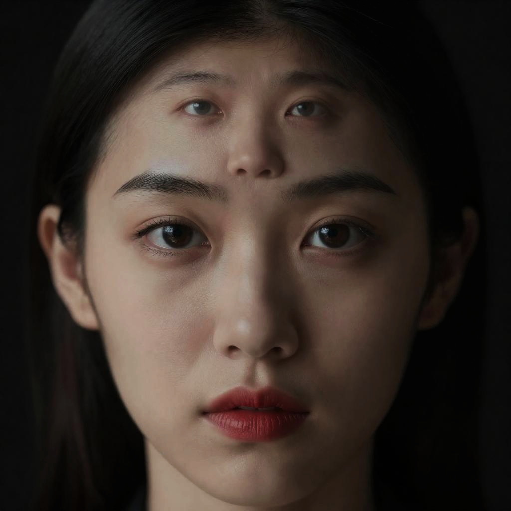 Photograph of a close-up, intense portrait. A woman with red lipstick and intense brown eyes gazes forward. A smaller, shadowy male face is superimposed on her forehead, looking down at her eyes. Black background. Woman's expression is serious, man's expression is neutral.