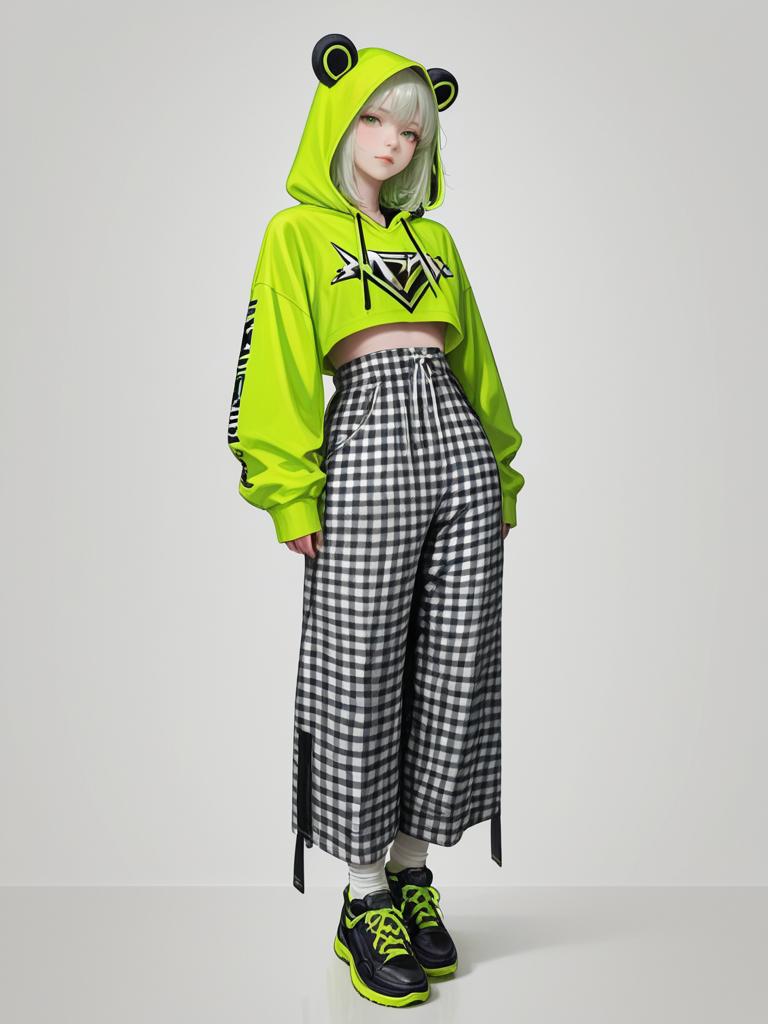 Full body shot of a woman wearing casual streetwear in a photo studio with a white background. She sports a neon green cropped hoodie with a drawstring hood, long sleeves, and black bear ear details on the hood. Her outfit is completed with black and white high-waisted gingham pants that are loose-fitting and cropped above the ankle, white socks, and matching neon green and black sneakers.