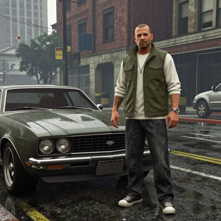Recognized HD Claude from Grand Theft Auto 3, standing next to a muscle car, raining, set in Liberty city streets, realistic, 4K,