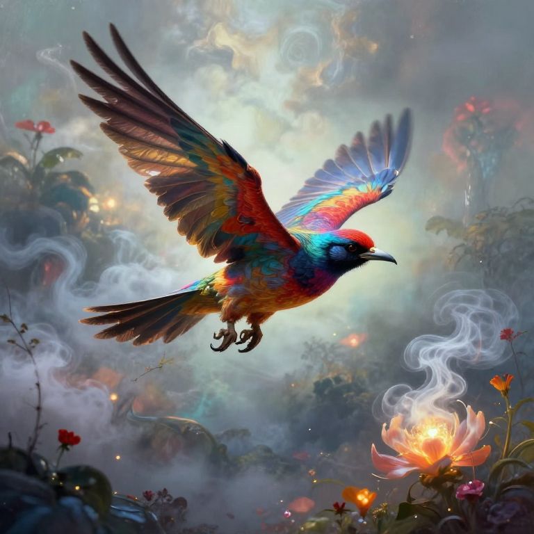 Opium bird art showing a fantastical bird soaring through a misty, opium-inspired landscape with clouds of fragrant smoke and glowing flowers, painted in a luminous palette with detailed textures that evoke a sense of wonder and mystery.