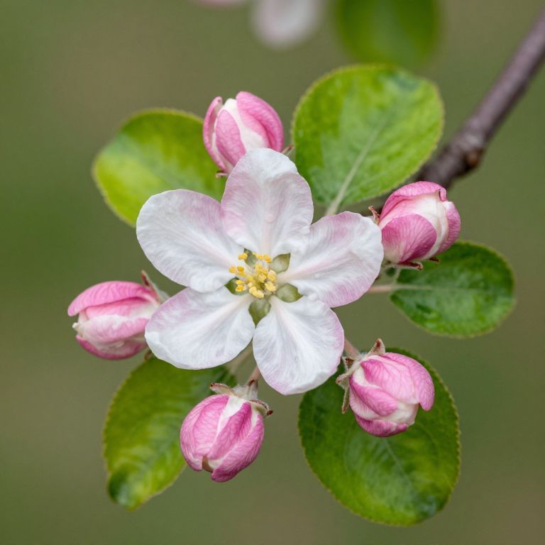 Blossoming apple flower with five delicate petals showcasing a gradient from white to soft pink, surrounded by vibrant green leaves and three tightly closed pink buds, all emerging from a dark brown branch against a blurred natural backdrop.
