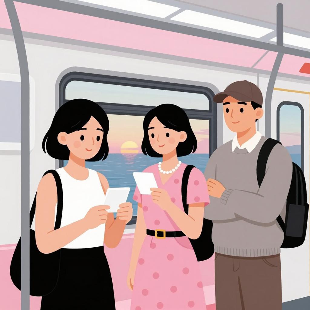 Illustration of a subway car with pink lighting. Three people: woman with black bob haircut, white sleeveless top, black skirt, holding card; second woman with black bob, pink polka dot dress, holding card; man with brown cap, grey sweater, Nike backpack, standing with arms crossed. Window shows sunset over ocean. Woman in foreground looks down at card. Second woman looks forward. Man looks outside window.