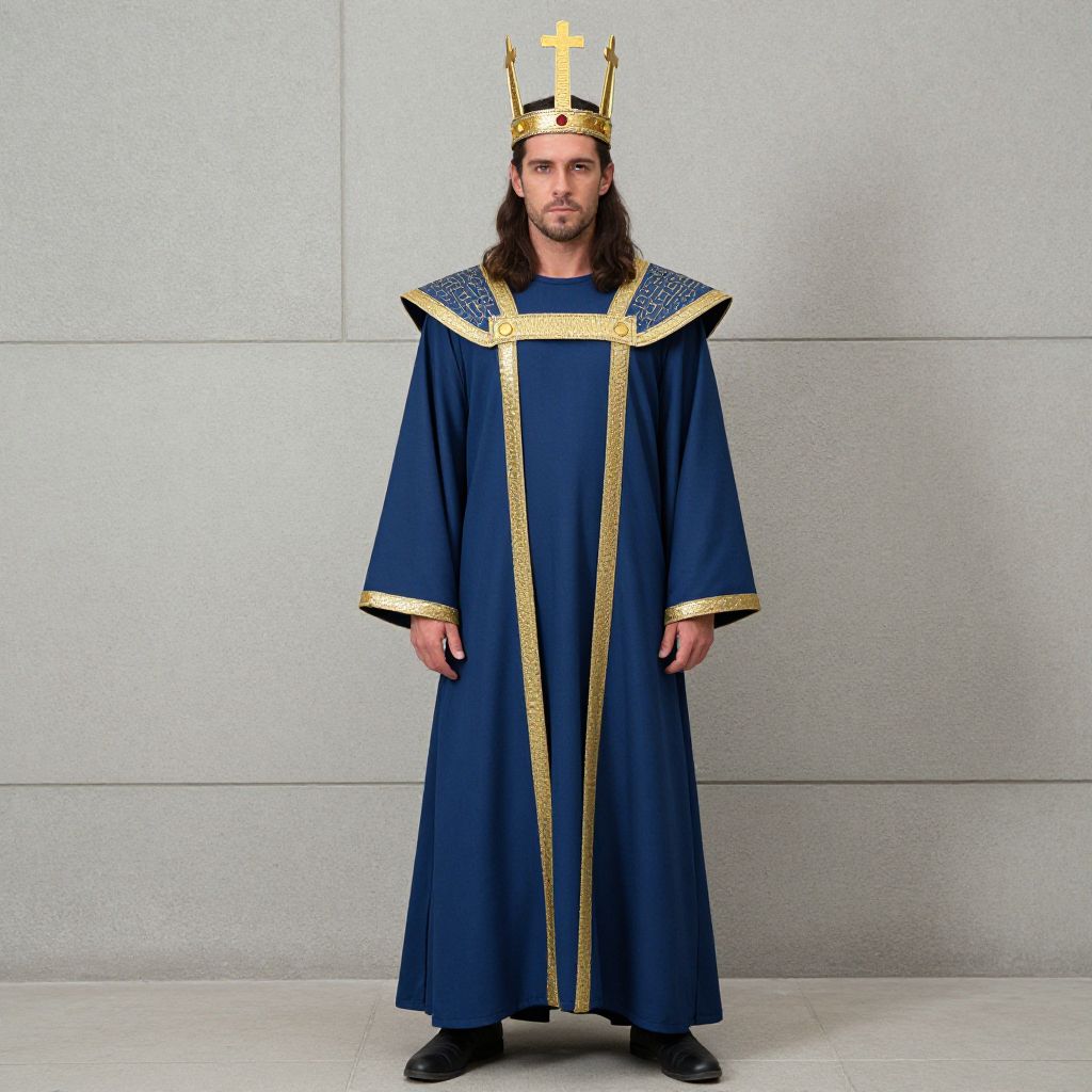 Photograph of a Caucasian man with long brown hair and a beard, standing against a plain light gray wall. He wears a regal blue robe with gold trim and a matching gold crown with a central cross. The robe has wide, decorative shoulder pieces adorned with gold embroidery. He stands with his hands by his sides, wearing black shoes. The image is brightly lit, highlighting the rich blue and gold textures of the robe and crown. The man's expression is neutral, and he looks directly at the camera.