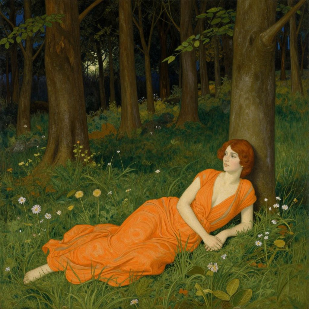 Artistic illustration of a fair-skinned woman with brown hair, wearing an orange dress, lying in a lush, forested meadow with tall trees