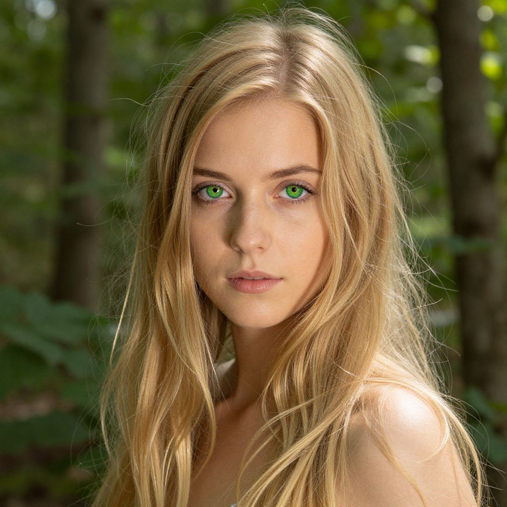 Natural blonde hair green eyes woman standing in a sunlit forest clearing, soft dappled light filtering through the leaves, serene expression, ethereal and whimsical atmosphere, detailed strands of hair shimmering, vibrant green eyes sparkling with life, high resolution.