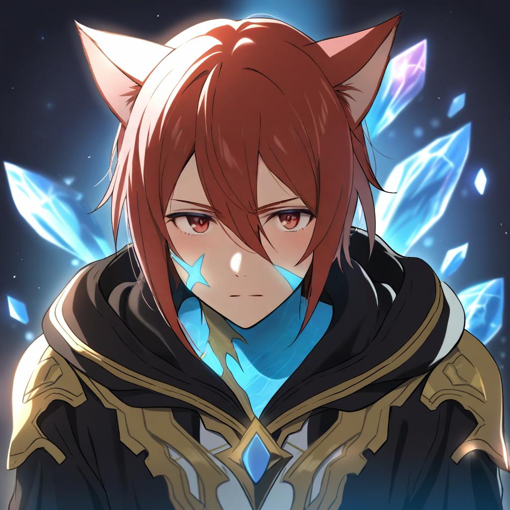 Crystal exarch, final fantasy, 1boy, cat boy, cat ears, red eyes, hair between eyes, slit pupils, red hair, short hair, hooded robe, black robe, hooded robe, black robe, hood down, miqo'te, material growth, facial mark, crystal, by artist ikari manatsu, animagine