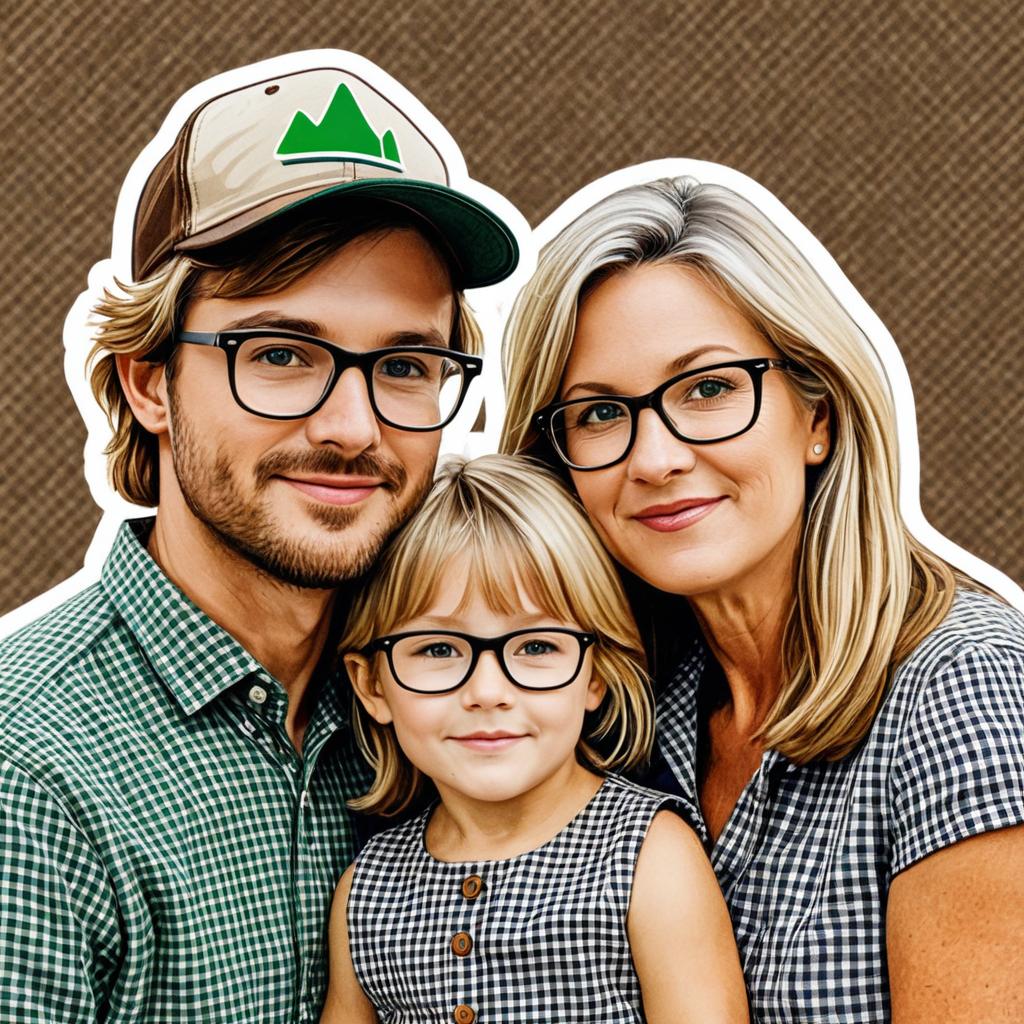 Eco-Friendly Sticker realistic drawing of a preschool boy with his mother and father, his mother is blonde with long hair, green eyes and glasses and his father is brown-haired with short hair, cap on the back and checkered shirt.