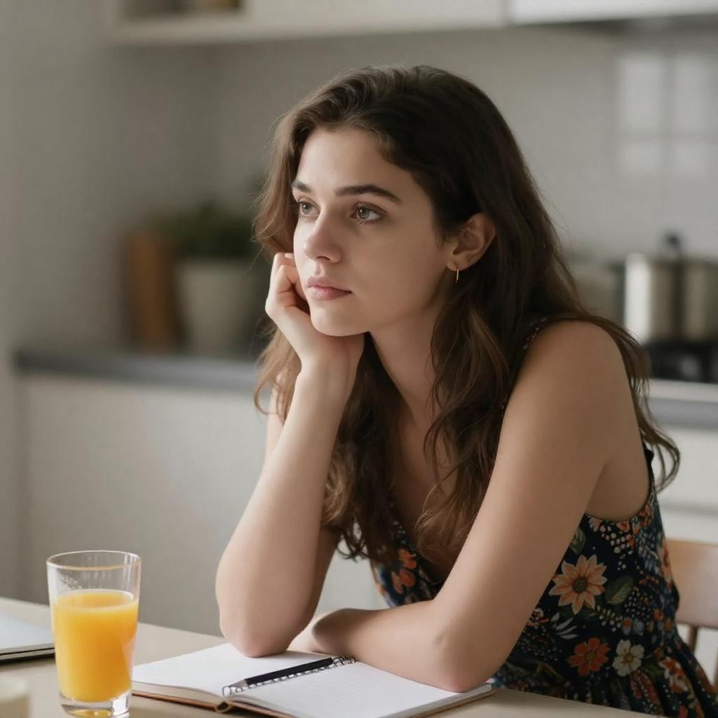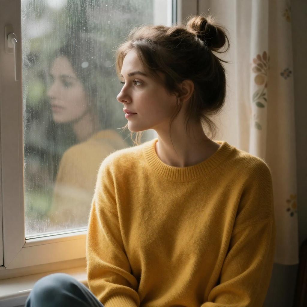 Photograph of a woman with light brown hair in a messy bun, wearing a mustard yellow sweater, sitting by a rain-streaked window. Soft sunlight illuminates her from the left. She looks to the side with a calm expression. Curtain with a floral pattern on the right.